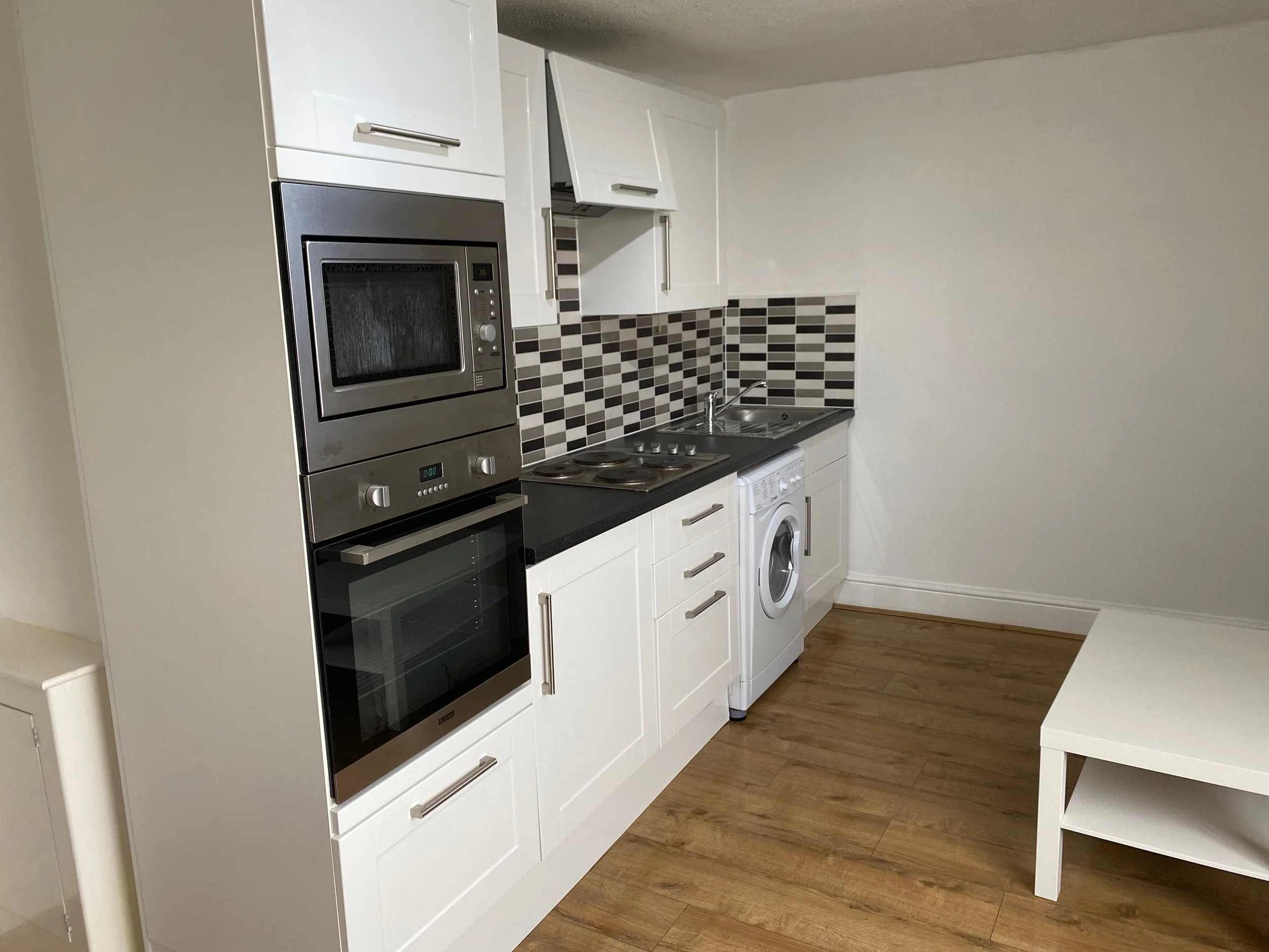 Kitchen features a washer/dryer, oven, microwave, hob, fridge/freezer, and plenty of storage.
