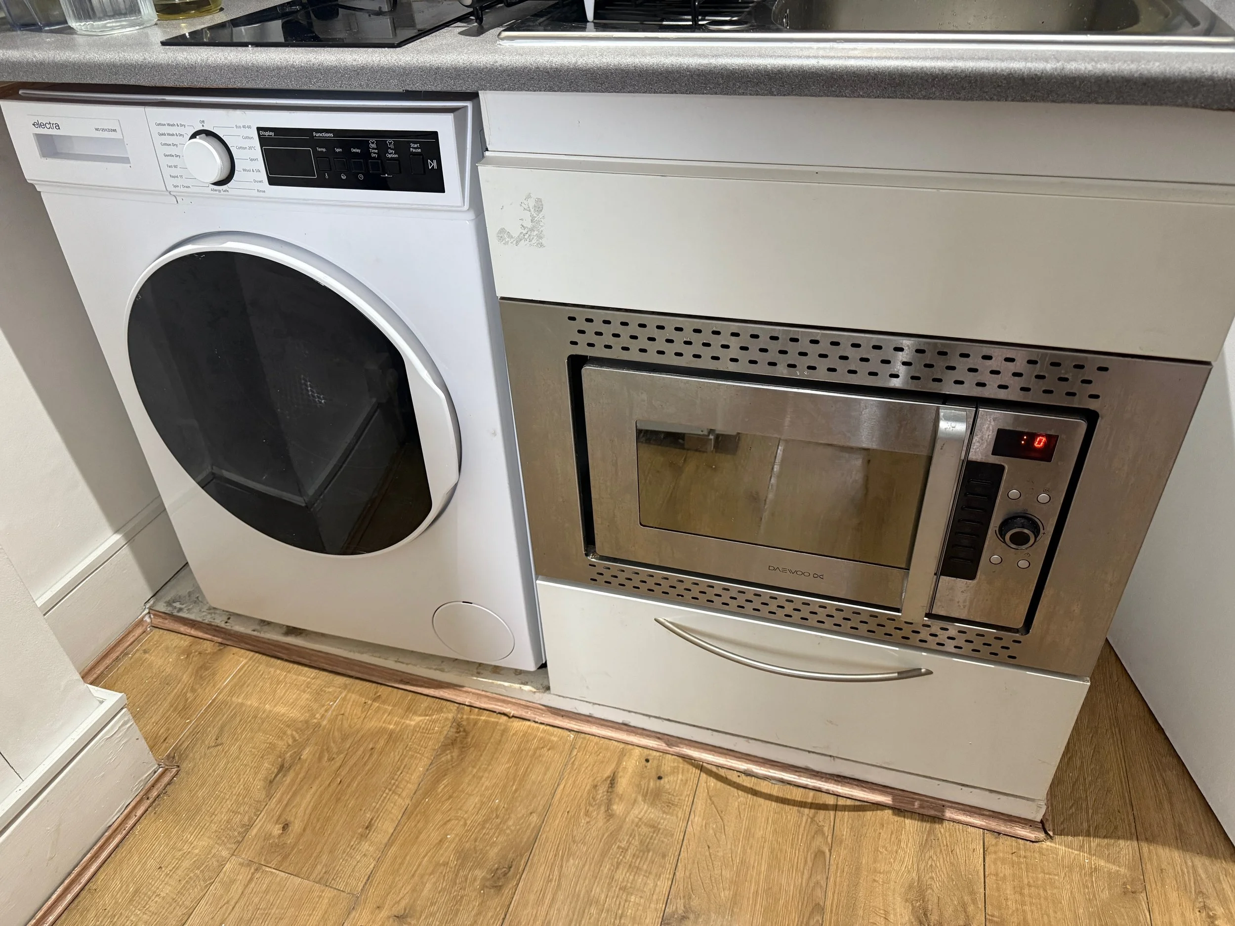 Kitchen features a washer/dryer combi oven/microwave, hob, fridge/freezer, and plenty of storage.