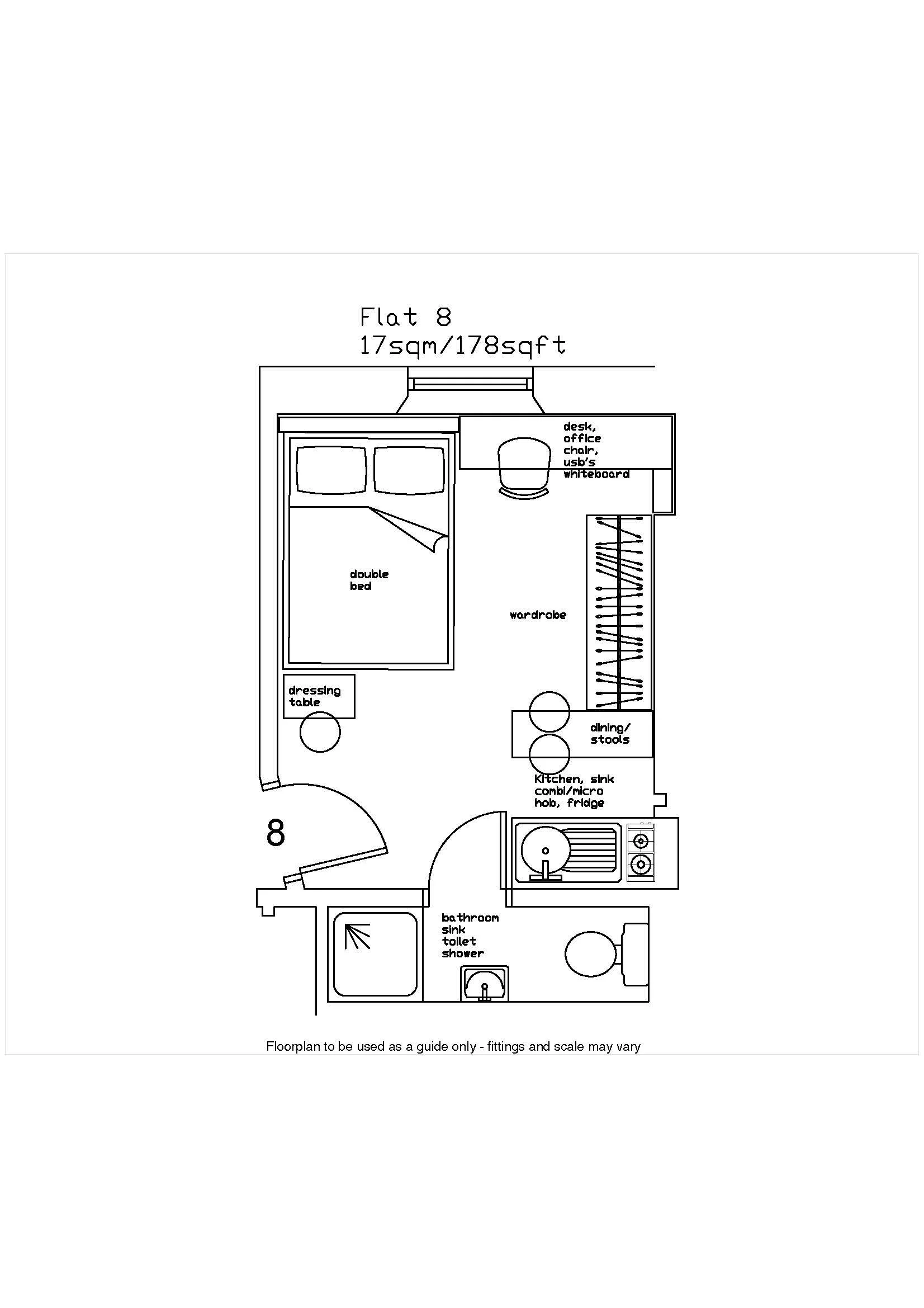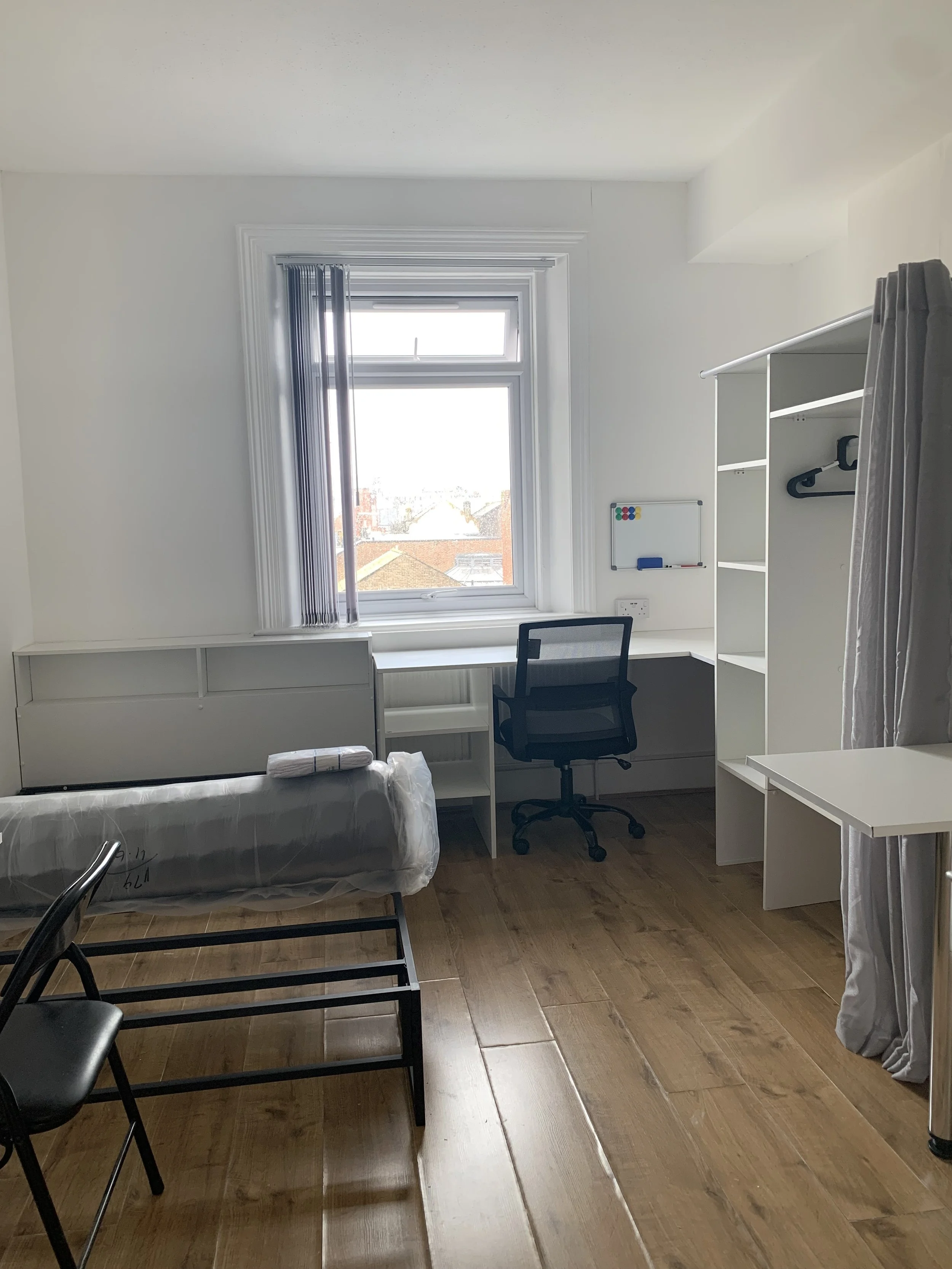 Studio includes a double bed, large fitted wardrobe, large fitted desk with chair and USB sockets and a dressing table with makeup mirror.