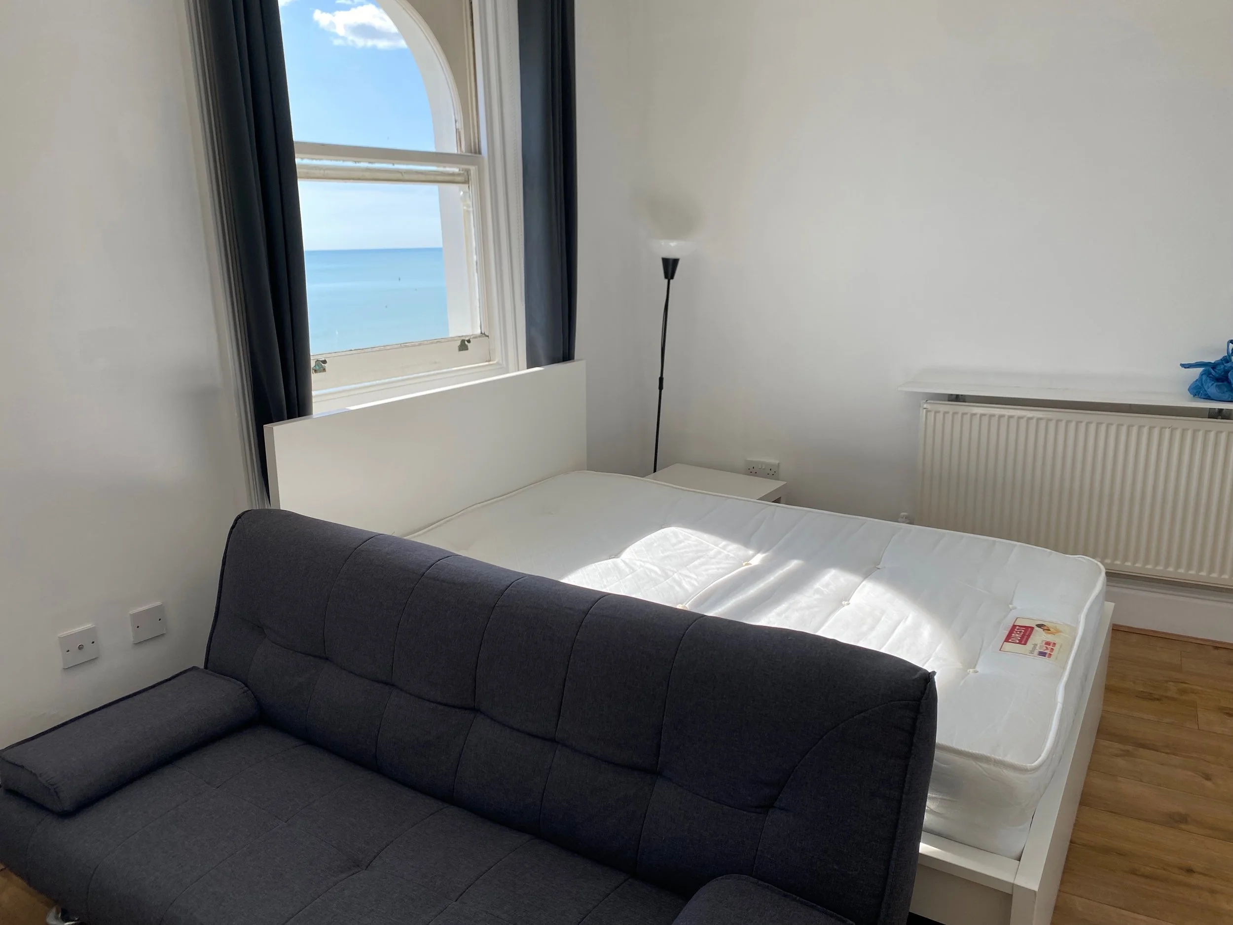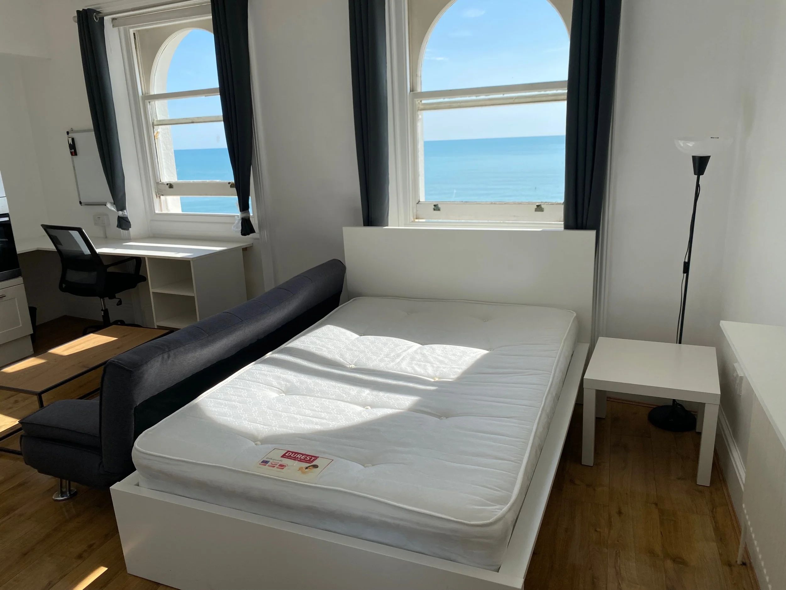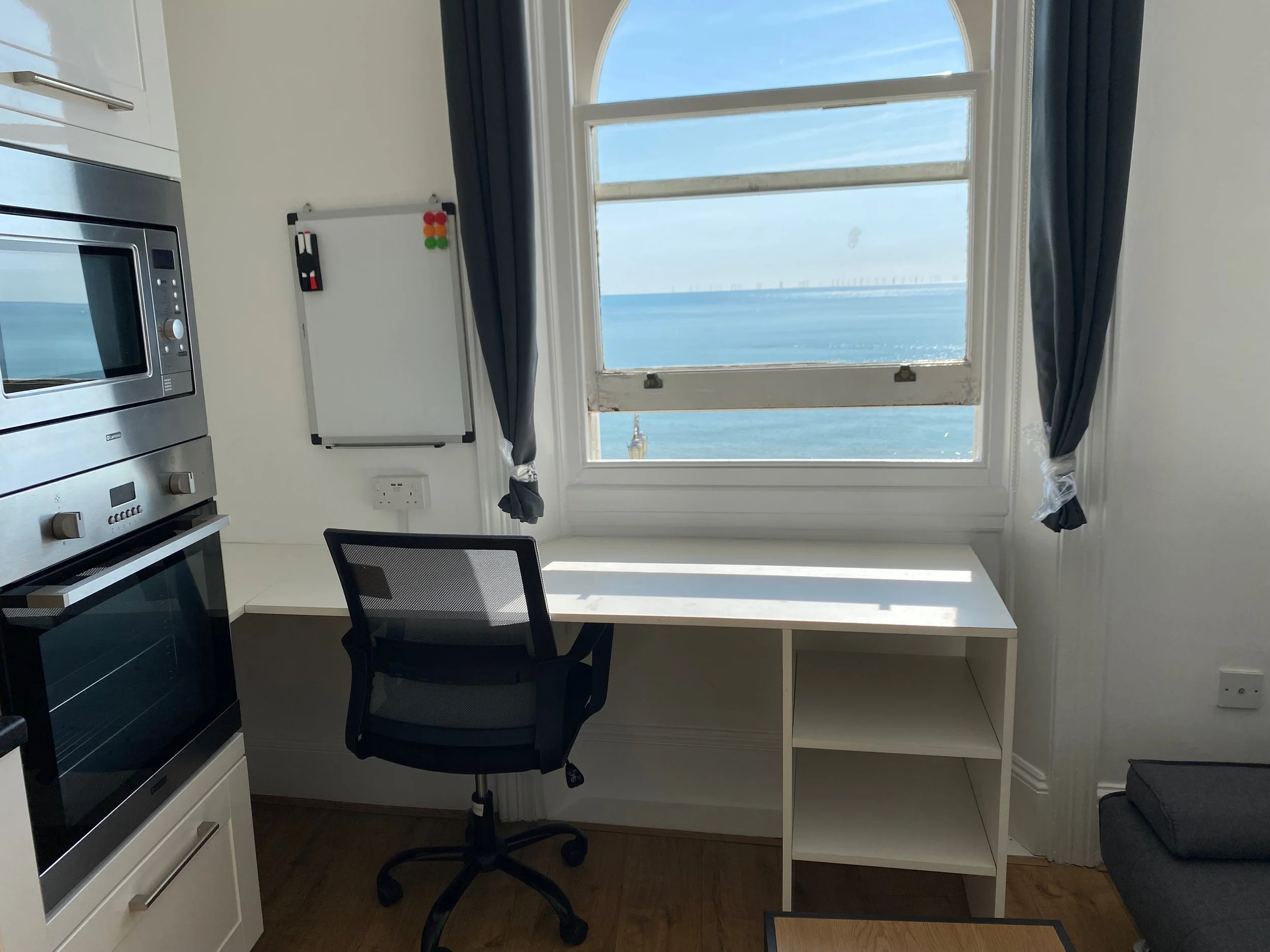 Lounge includes a double bed, double sofa-bed, coffee table, and a large fitted desk with chair and USB sockets, dining table and a built in double wardrobe