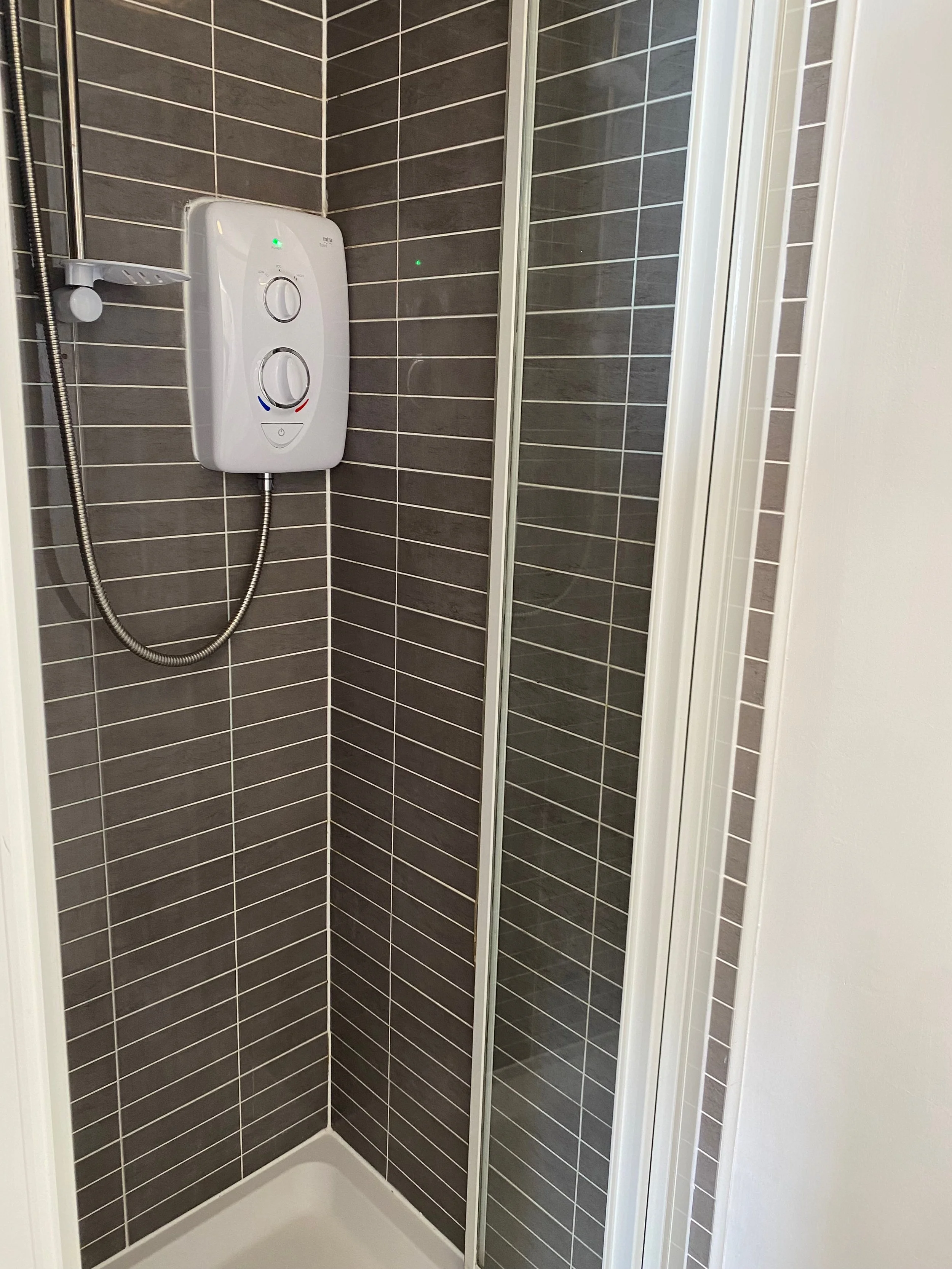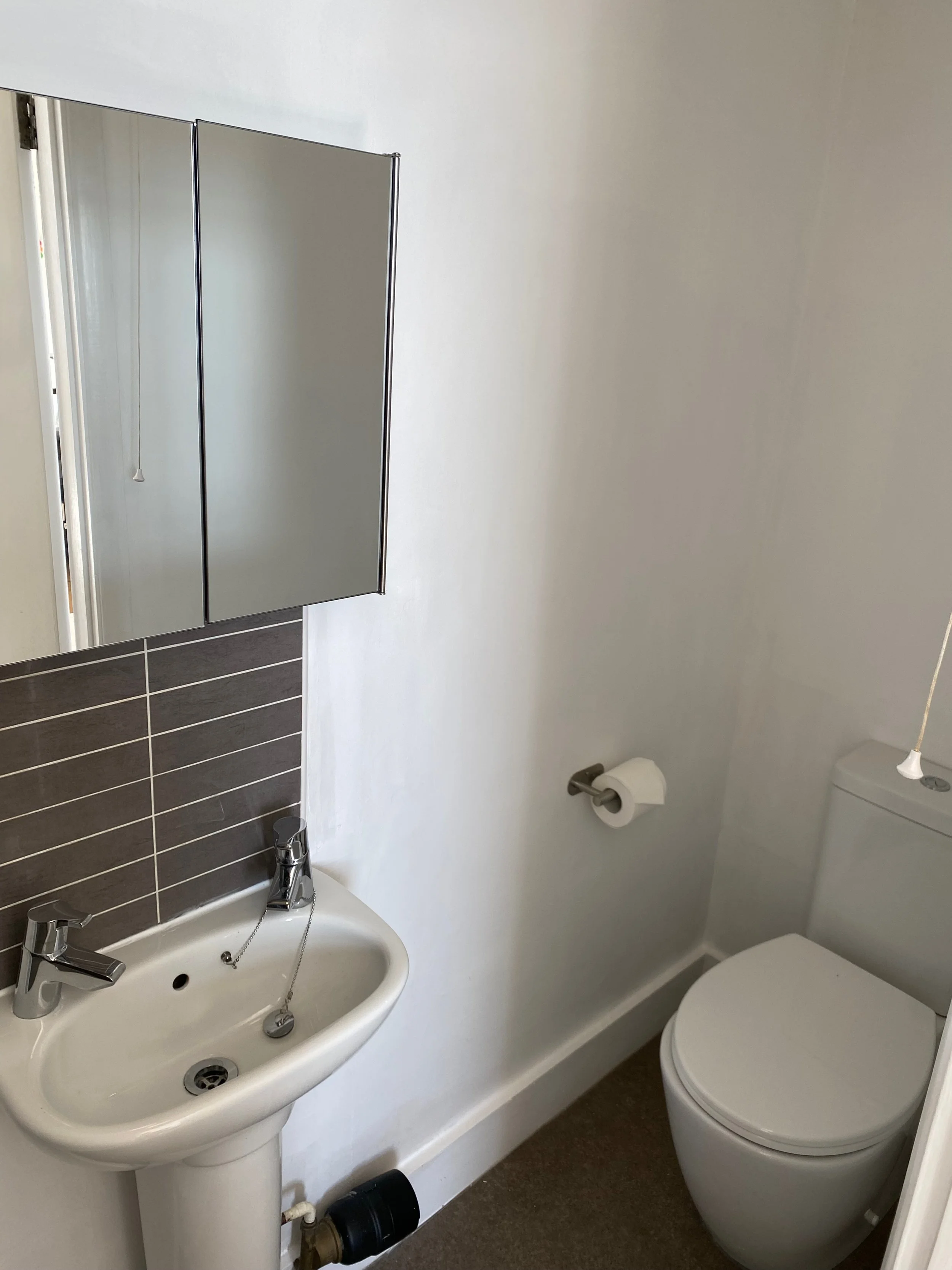 Bathroom includes a shower, sink, toilet, and medicine cabinet.