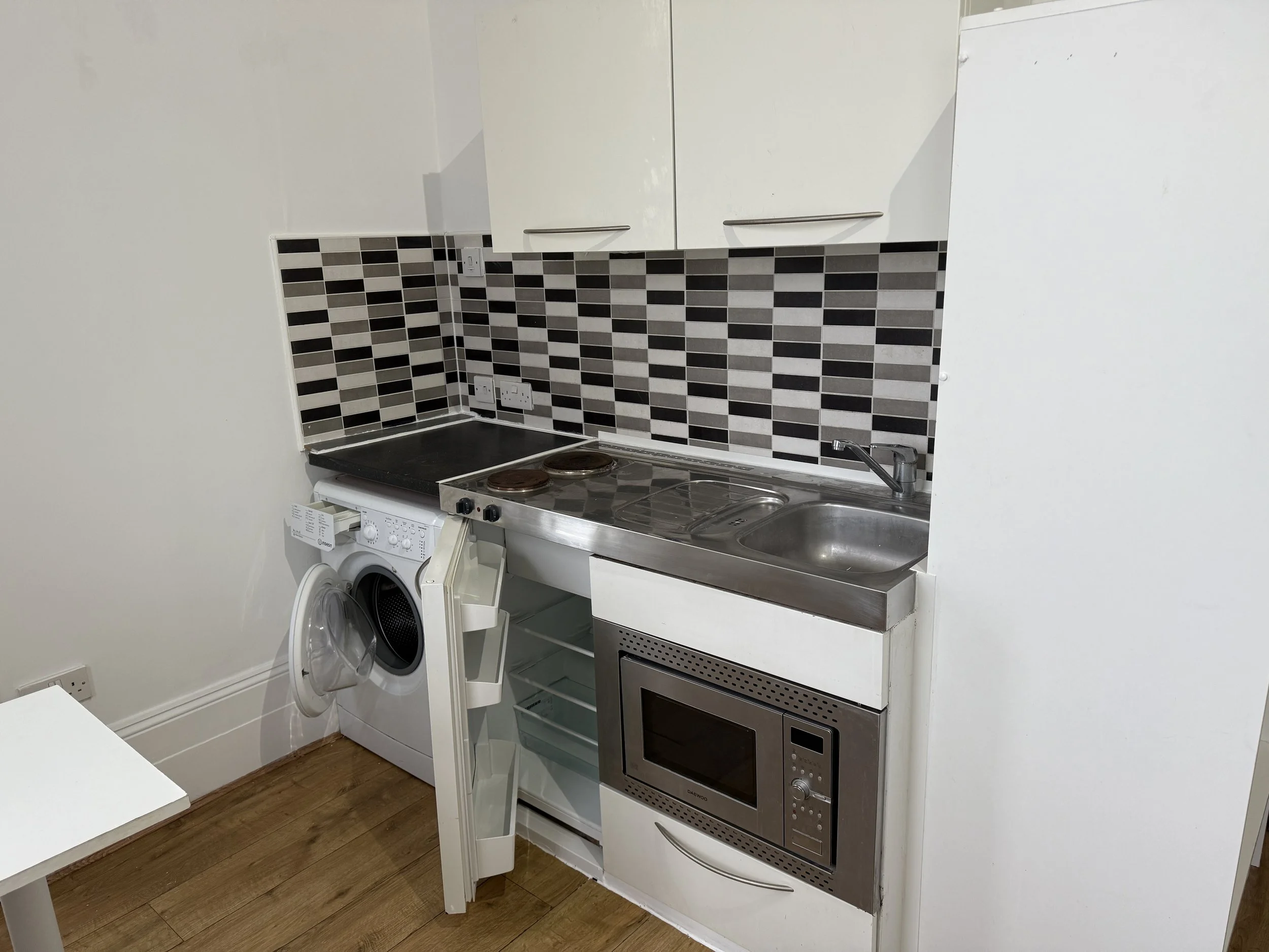 Kitchen features a washer/dryer, combi oven/microwave, hob, fridge/freezer, and plenty of storage.