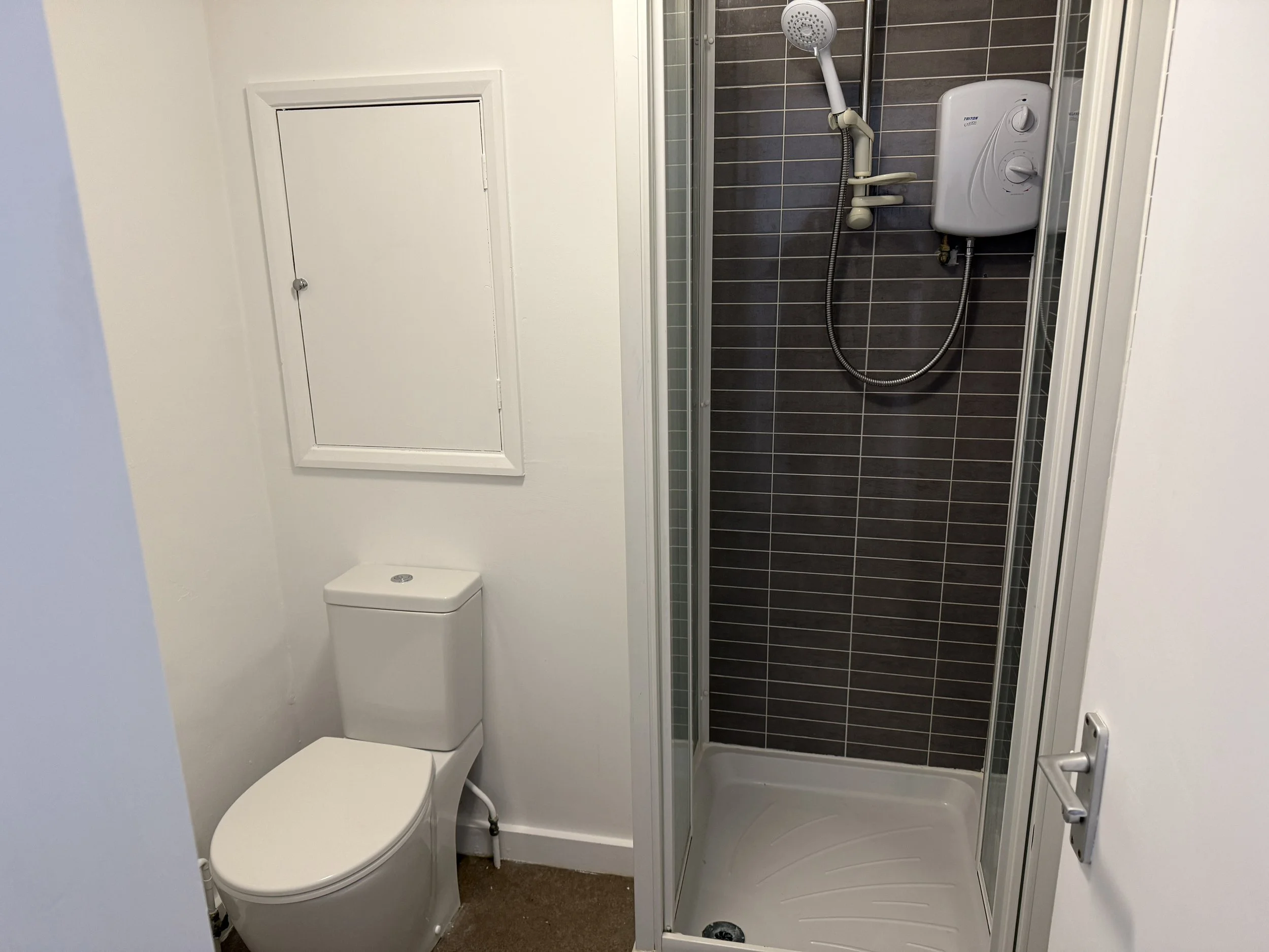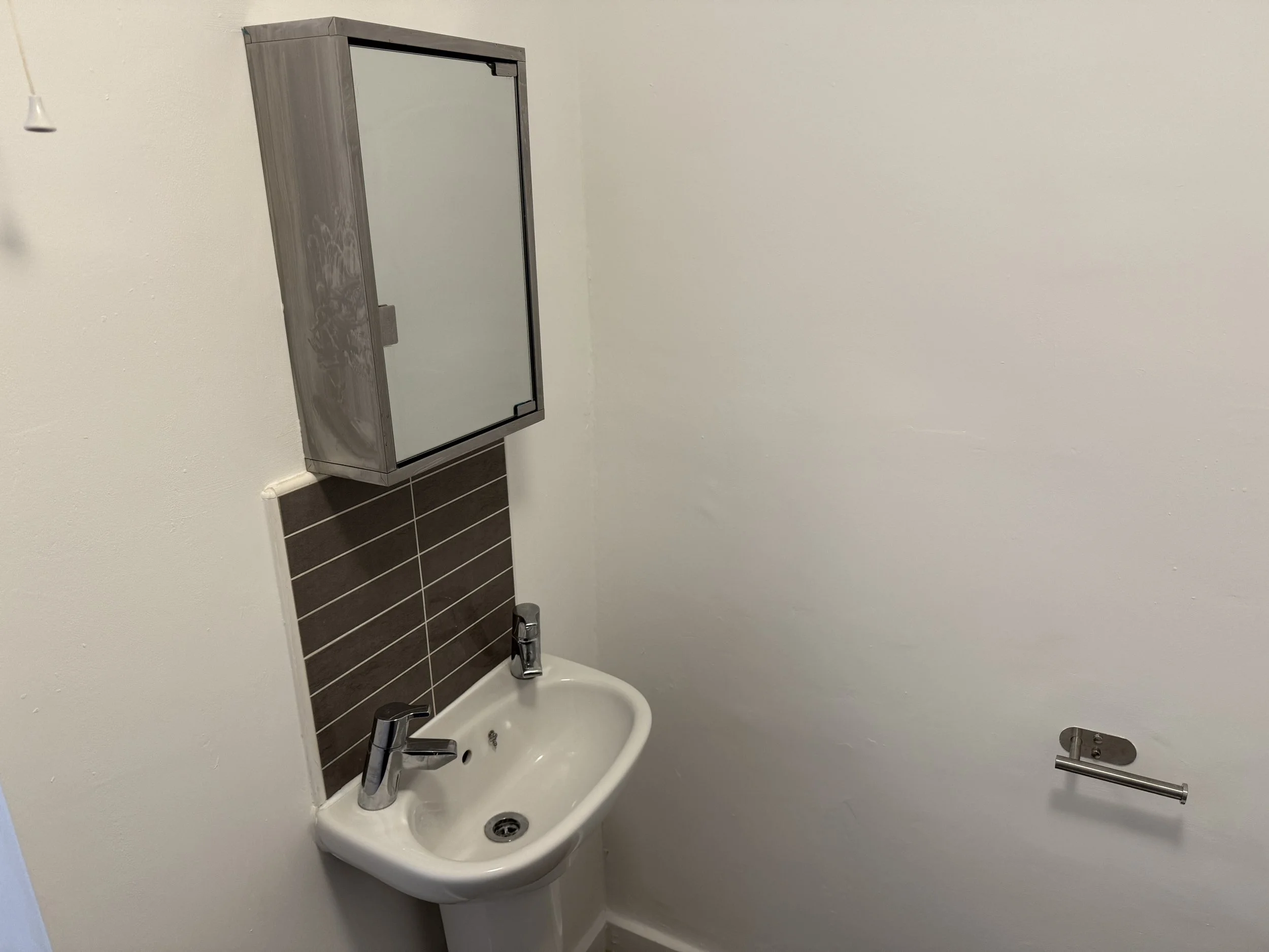 Bathroom includes a shower, sink, toilet, and medicine cabinet.